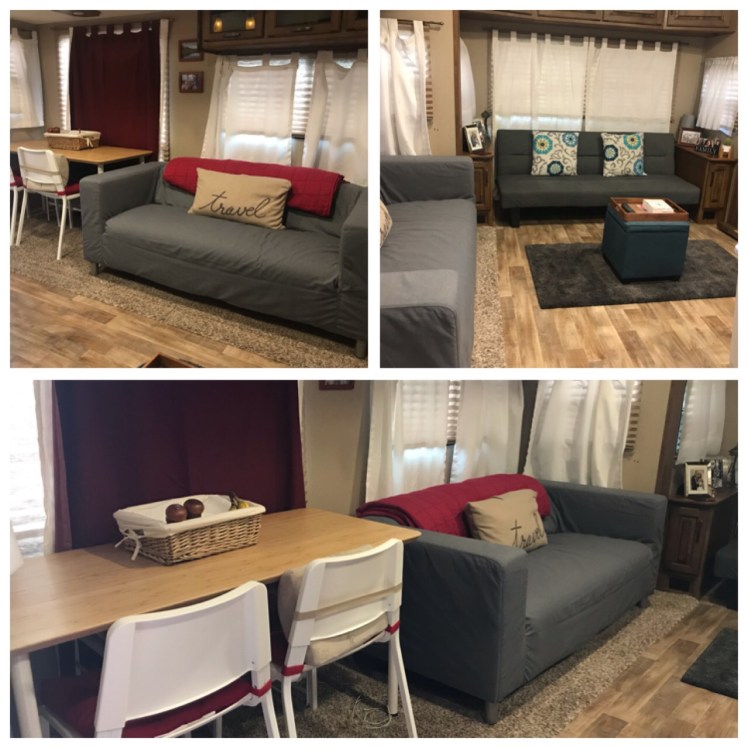 We started the new year with getting little things we needed for the RV, like wheel covers and more organizers which lead to a mass cleaning and re-organizing of the RV. We had been talking about getting new furniture for the kitchen/living room and one day we just decided to post items on multiple buy, sell, trade Facebook groups and right away people responded. Within a week, we sold the kitchen table, two couches and replaced them all with furniture from Ikea and Walmart. We didn’t want to spend any extra money getting the new furniture so the money we got selling is what we spent. We are happy with the results and we need to compete a couple more projects, like getting a new headboard, stick and peel title stickers for the kitchen and printing travel photos before we are all set.