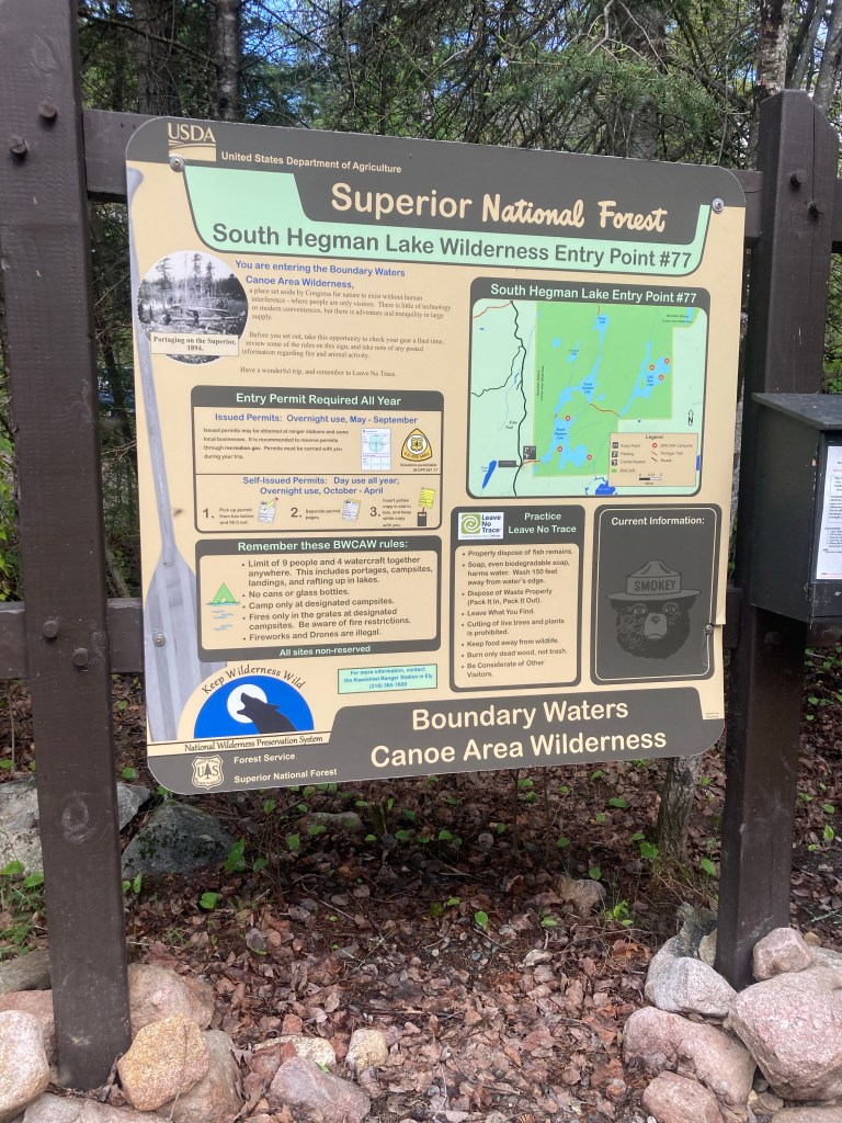 There are hundreds of different access points to the BW and we decided to use the Hegman Lake Canoe Access as it was only an hours drive and the trail to the lake was only a 1/4 mile. We parked, got out of the car and were greeted by hundreds of mosquitoes so there went our great mosquito avoiding plan. Lol. 🤣