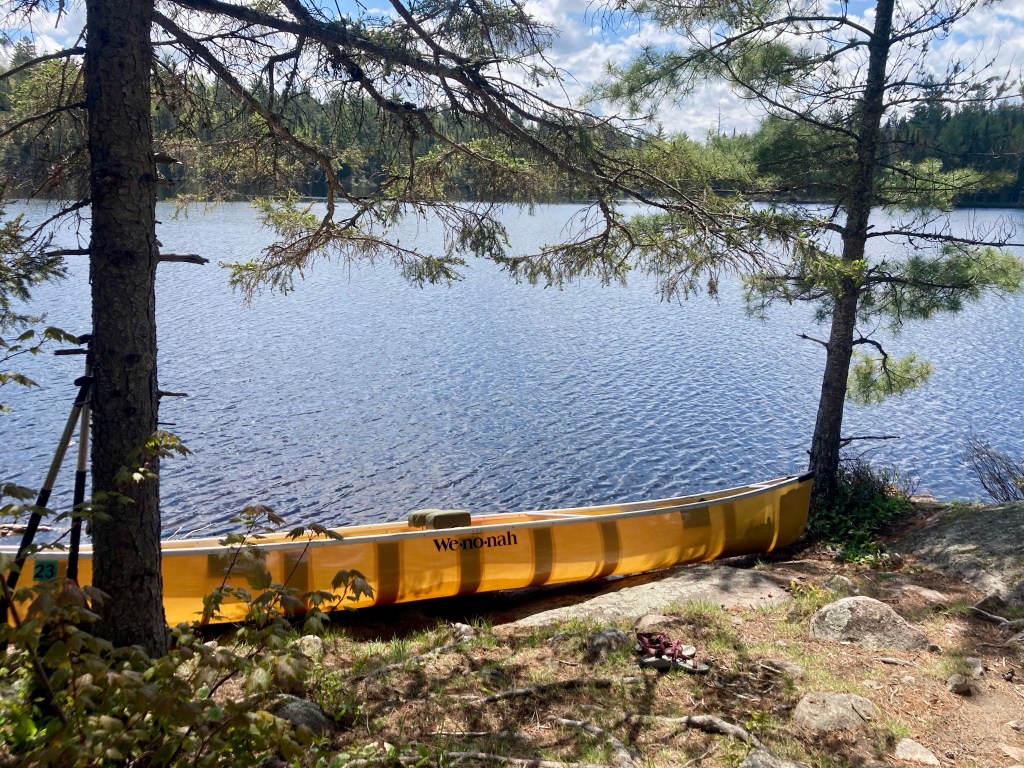 After we canoed around the lake, we were ready to move on to the next lake. The lakes here are not connected by water but by walking trails, called portages. So, to get from one lake to another the canoe is beached, we get out, take out our gear and carry the canoe plus gear to the next lake. Plus, not worrying about tipping the canoe or scrapping it against rocks.